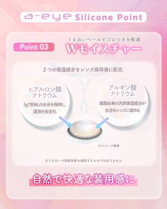 2つの保湿成分(ヒアルロン酸ナトリウム、アルギン酸ナトリウム)をレンズの保存液に配合することで、ゴロつきを軽減し、自然で快適な装用感を実現します。