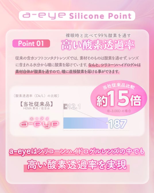 a-eyeは、素材自体が酸素を通す「シリコーンハイドロゲル素材」でできているため、瞳に直接酸素を届ける事ができます。
