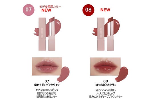 この度加わるのは、大人っぽく儚げな印象を演出する白みピンク系の「07 幸せを掴むピンクダイヤ」と、洗練された深みのあるレッド系の「08 待ち焦がれシトリン」のトレンド感あふれる2色。
