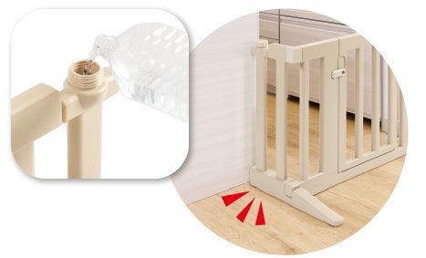 赤ちゃんにとってお家の中は危険な場所がたくさんあり、ハイハイしたり歩けるようになるとますます目が離せなくなります。リッチェルの「おくだけフェンス」はお家の危険から赤ちゃんを守るために、キッチンの入り口や階段下などの進入してほしくない場所に簡単に設置できます。壁をキズつけない置くだけのタイプで、前からも横からも進入を防ぎます。さらにサイドパネルに水を入れる注水式なので水の重さでズレにくい構造です。プラスチック製なのでサッと拭けてお手入れも簡単です。また別売りの拡張パーツを使用すると、設置場所の幅に合わせて141cmまで拡張することができます。