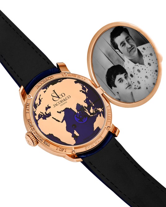 ロケットスタイルのケースバックにはジェイコブアラボと、その父ニソン・アラボの在りし日の写真が納められる