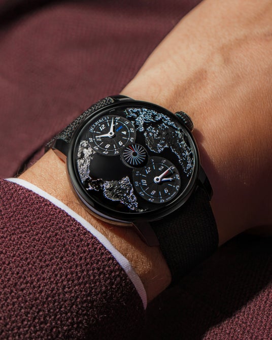 このモデルは、ブラックDLCのケースにブラックPVDで仕上げられた大陸と海を組み合わせ、マッドパリを象徴する“オールブラック”のカラーコードを纏っています。まるで夜の地球を高高度から見下ろしたかのようなこのデザインの最大の特徴は、都市の光を思わせる部分に施されたスーパールミノバ(蛍光塗料)です。暗闇の中で文字盤が静かに光を放つその姿は、まさに夜空を漂う惑星のよう。