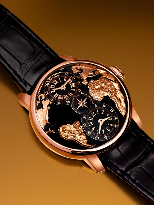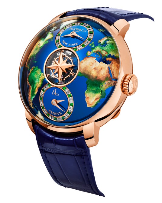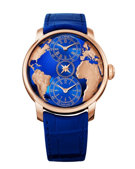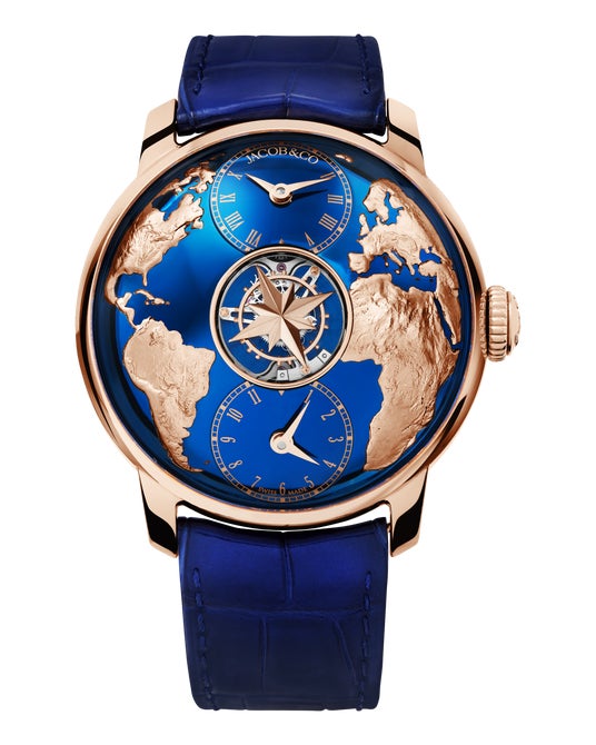世界地図を描いた立体的なダイヤルは、海と大地のコントラストが息をのむほどに美しく、ジェイコブ&コーらしい“感情を呼び起こす時計”として高く評価されています。