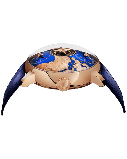 立体彫刻で描かれた金色の大陸と、ブルーPVDによって深く輝く海。18Kローズゴールド製のラウンドケースに、緩やかにカーブを描く文字盤とサファイアクリスタルが重なり合うことで、まるで腕元に“地球”そのものを宿したかのような存在感を放ちます。その時計を着けた瞬間、まるで世界が自分のものになったかのような錯覚に包まれる――そんな詩的な体験を与えてくれるのです。