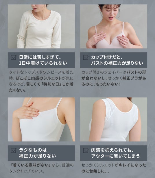 💬「カップ付きのシェイパーだとバストの形が合わず、お気に入りのブラを諦めるしかないのが悲しい…」