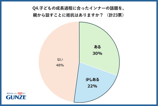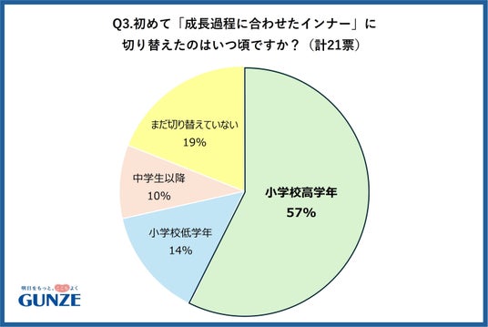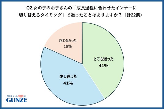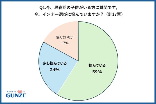 グンゼの公式Xを活用し、ジュニアインナーに関するアンケート調査を実施しました。「今」、思春期の子どもを育てている方のうち、インナー選びに「悩んでいる」と答えた方は82%、また成長に応じた切り替えタイミングに「迷ったことがある」方も8割以上にのぼり、選び方の難しさが明らかになりました。切り替え時期としては「小学校高学年」が57%で最多となった一方、インナーについて子どもと話すことに抵抗がある人も半数を占める結果となりました。