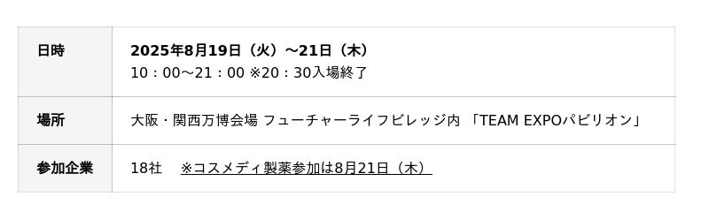 コスメディ製薬株式会社(本社:京都市、代表取締役社長:権 英淑)は、近畿経済産業局「関西ものづくり新撰2025」選定企業と共に、大阪関西万博会場内「TEAM EXPOパビリオン」にて展示を行うことをお知らせします。