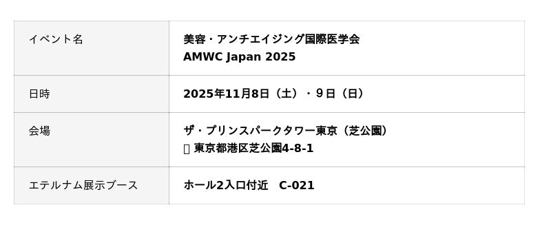 11月8日(土)・9日(日)The Prince Park Tower東京にて開催される世界トップクラスの美容医療及びアンチエイジング専門医が一堂に会し、専門知識を共有することができる唯一無二の国際医学会シリーズ「AMWC」に出展します。本展示会では、ヒト臍帯由来間葉系幹細胞培養上清液を高配合した医療機関専売品である「エテルナムDR」シリーズを展示いたします。