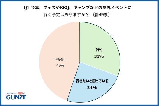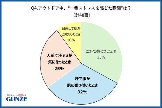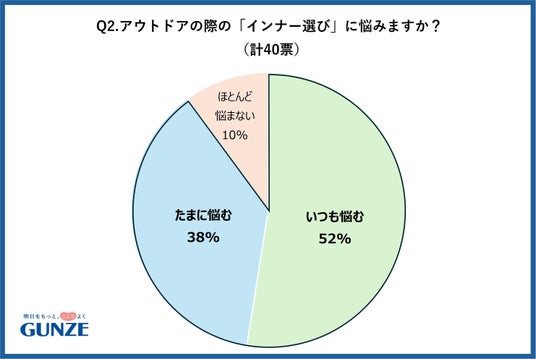 グンゼの公式Instagramを活用し、アウトドアとインナーに関するアンケート調査を実施しました。フェスやBBQなどのアウトドアの際、インナー選びに「いつも悩んでいる」「たまに悩む」と答えた方は90%と、選び方の難しさが明らかになりました。また、汗や紫外線対策として機能性インナーで対策をしている、したいと回答した方は76%にのぼり、アウトドアシーンの快適性を左右する要素として、インナーへの関心の高さがうかがえました。また、汗はアウトドア中にストレスを感じる要因となっており、57%の人が汗による不快を感じていました。