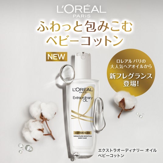ロレアル パリは、ヘアオイル「エクストラオーディナリー オイル」シリーズから新作「エクストラオーディナリーオイル ベビーコットン」を 2025 年 9 月 20 日(土)より全国発売いたします。フローラル、オリエンタル、フルーツをベースにした香りが象徴的なシリーズラインナップから全く新しい香り「ベビーコットン」は、パーソナルで、肌に寄り添うような、本質的な心地よさを追求致しました。 まさに週末の朝、洗濯物からふわっと香るやわらかなコットン、洗い立てのリネンのように、優しく、どこまでもピュアな香りが特徴です。自然に、ふんわりと髪に馴染み、控えめながらも好印象を与える清楚感をさりげなくプラスします。