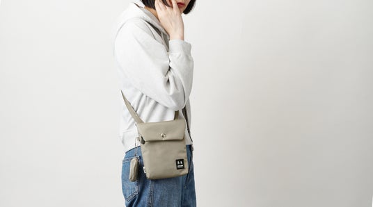 落ち着いたカラーのスマホジャストなポシェットは、シンプルなのでカジュアルにもきれいめにも合わせやすい。