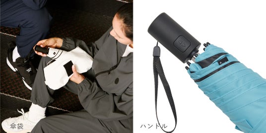 持ち運びに便利なミニサイズ。カバンに入れても邪魔にならないサイズ感が特徴です。雑にたたんでもしっかりまとめられる太いバンドと、留める位置を調整できる面ファスナー、たたまずにサッとしまえる傘袋など、日常での使いやすさを追求しました。