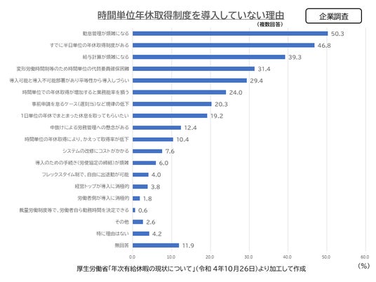 「時間単位年休制度を導入していない理由」を未導入企業に調査した結果では(図3)「勤怠管理が煩雑になる」が50.3%ともっとも高く、次いで「すでに半日単位の年休取得制度がある」(46.8%)、「給与計算が複雑になる」(39.3%)が上位を占めていました。