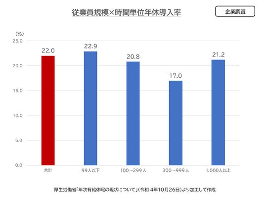 7割以上の企業が時間単位年次有給休暇制度を未導入時間単位年次有給休暇制度は、企業に導入が義務付けられているものではなく、任意の制度です。現在企業の導入率は上昇傾向にあるものの、2022(令和4)年10月に厚生労働省が発表した調査資料では、導入率は22.0%(※図1)、コスメディ製薬と同規模である従業員数100~299人の企業においては導入率は20.8%に留まっています。(※図2)