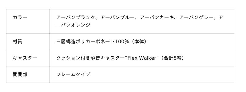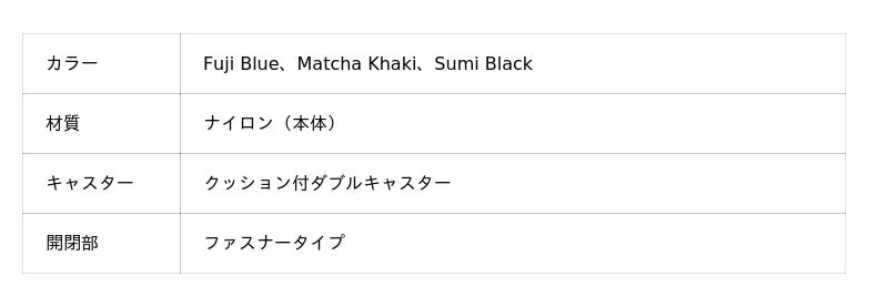 M・Lサイズでは、SS・Sサイズにはない機能として、収納量を調整できる約3cmの容量拡張機能や、サイドハンドルと台座、クッション付きダブルキャスター(取り外し不可)を採用しています。カラー展開は、Fuji BlueとMatcha KhakiをSS~Lの全4サイズで展開し、M・Lサイズ限定で新たにSumi Black(スミブラック)を追加。Washi IvoryはSS・Sサイズのみで継続展開します。価格は、Mサイズが19,580円、Lサイズが21,780円(いずれも税込)です。