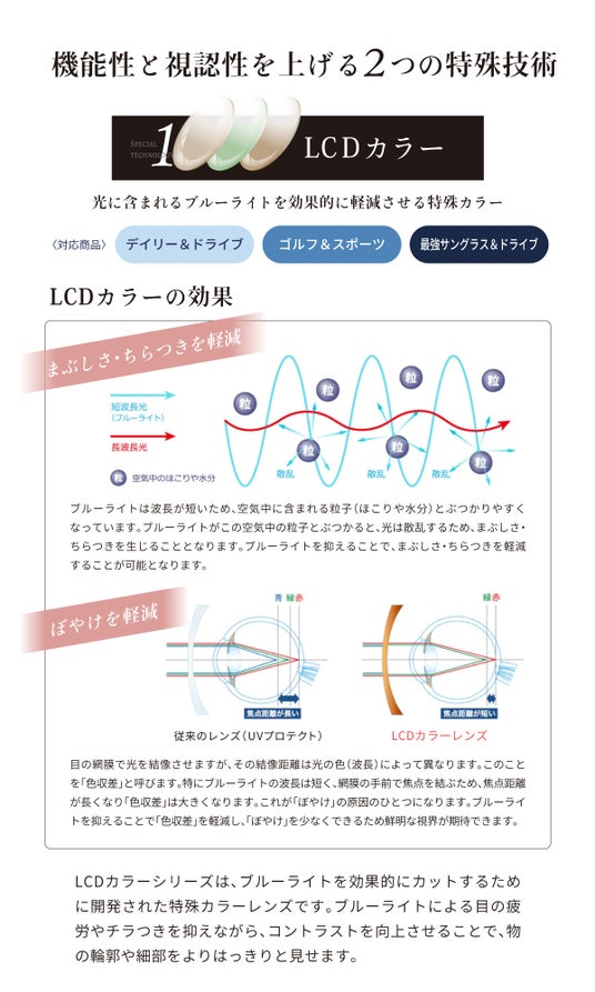 LCDカラー技術: まぶしさやチラつきの原因となるブルーライトを効果的にカットし、モノの輪郭を際立たせることで、くっきりとクリアな視界を実現します。