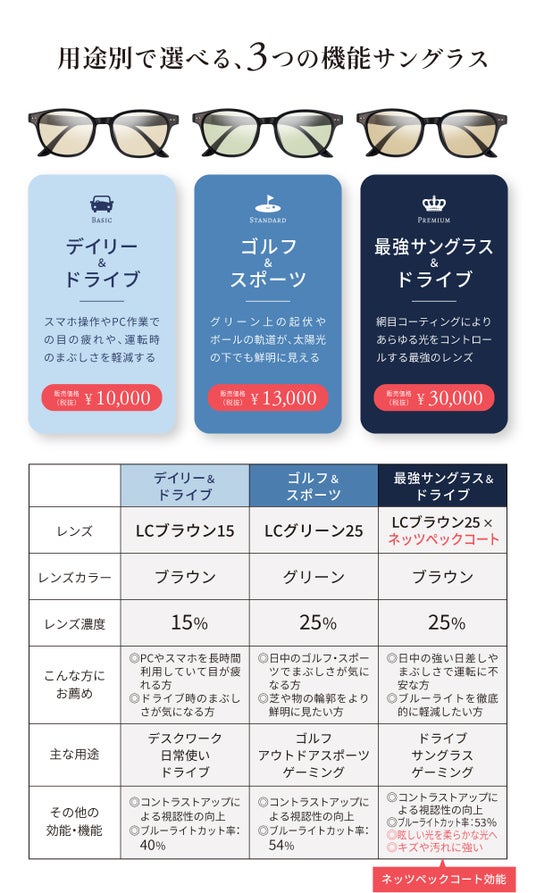【最強サングラス&ドライブ】: 強い日差しや眩しさを徹底的に防ぎたい方に。独自技術「ネッツペックコート」を搭載し、プロ仕様の快適な視界を提供します。