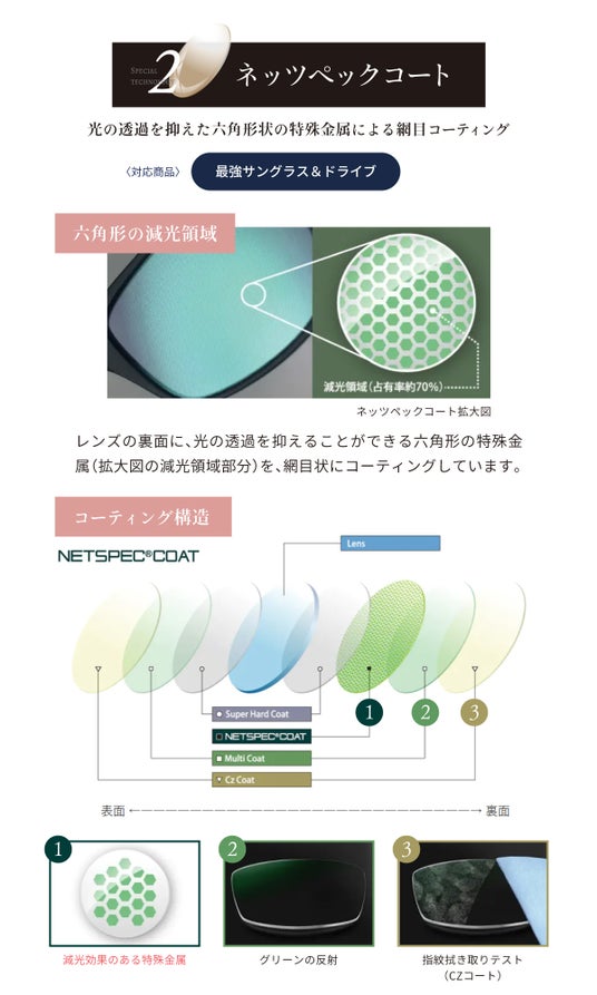 ネッツペックコート: レンズ裏面の六角形メタルコーティングが光の量を抑制。木漏れ日のような優しい光に変換し、目の負担を極限まで減らします。(※最強サングラス&ドライブモデルに搭載)