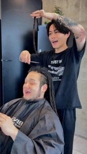 5年間続けたドレッドヘアを、彼女の親御さんと会うためにイメチェン。ハサミが入った瞬間の表情が、お客様の決意を物語っています。