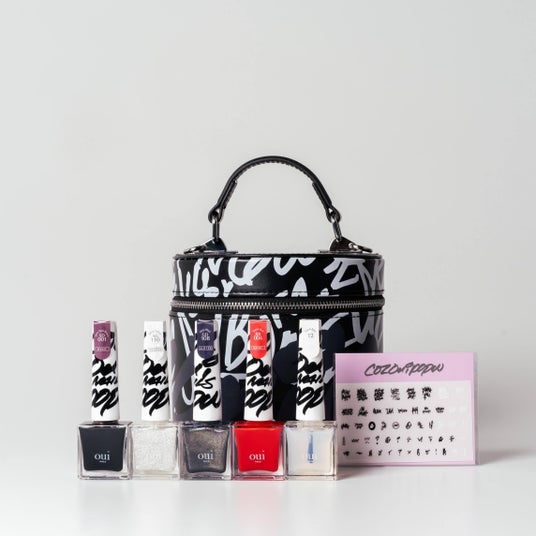 COZがファッション視点でセレクトした2種のカラーセットは、 指先に纏うだけでスタイリングを格上げし、トレンドと日常使いのバランスも抜群。それぞれのセットは、内田氏によるグラフィティアートが大胆に施されたバニティバッグとともに、 今だけの限定アイテムとして登場します。