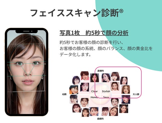フェイススキャン診断(R)は、AIが顔のタイプ・黄金比・肌状態を分析し、個々に最適なメイクやスタイリングを瞬時に提案するサービスです。