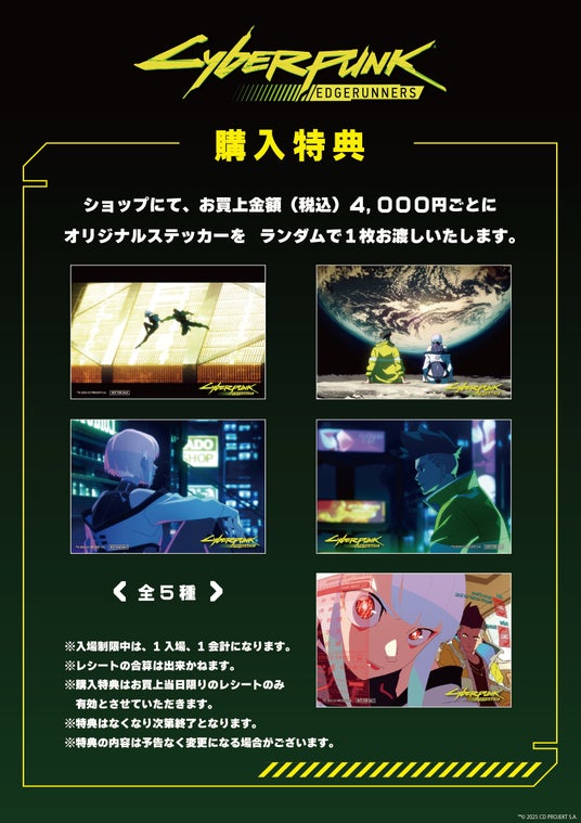 期間中、イベントショップでのお買上げ金額税込4,000円ごとに、オリジナルステッカー(全5種)をランダムで1枚お渡しいたします。