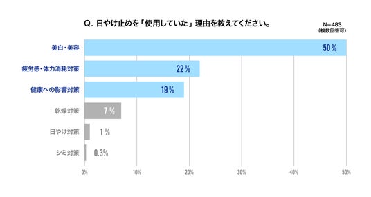 もともと日やけ止めを使用していた人に「使用していた理由」を尋ねたところ、全体の50%が「美白・美容」と回答。一方で、「疲労感・体力消耗対策」と答えた人は22%にとどまりました。