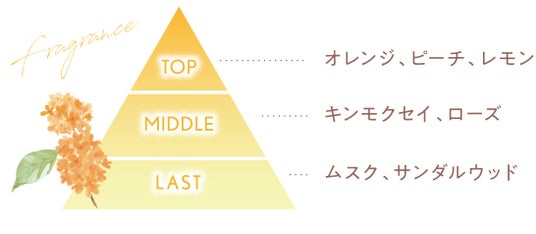 みずみずしいオレンジのはじける香りが、ほんのり甘いピーチと清涼なレモンで彩られ、一日の疲れを解きほぐしていきます。