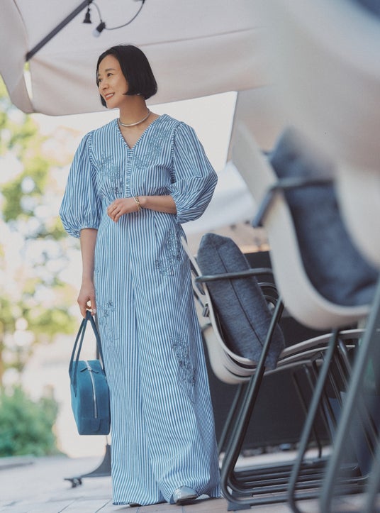 見た目も肌心地も涼やかなコットンポプリンのストライプ生地に、同色でシャープな刺繍を施したオールインワンやノースリーブブラウス、サスペンダーパンツをはじめ、引き続きトレンドとして注目されているシルバーカラーの箔プリントが華やかなワンピース、リュクスなカラーのボウタイブラウス&フレアスカートなどウエア9型がラインナップ。