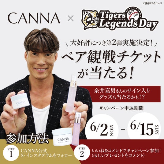 CANNAの販売を行う株式会社アッツ(所在地:大阪市北区、代表:山崎晶久)は、第一弾に引き続き阪神タイガースとのスペシャルキャンペーンを、2025年6月2日(月)より期間限定で展開いたします。公式Instagram・Xをフォロー&いいね&コメントでペア観戦チケットが当たる他糸井嘉男さんのサイン入りグッズなどが当たります。