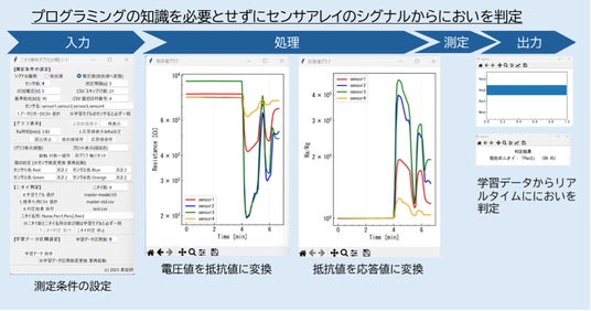 市販のガスセンサと汎用データロガーを組み合わせ、低コストで導入できる「においセンサキット」から出力されるデータを解析するための「におい判定アプリ」を開発することで、研究者・企業が容易に「におい解析実験」を行えるプラットフォームを実現しました。