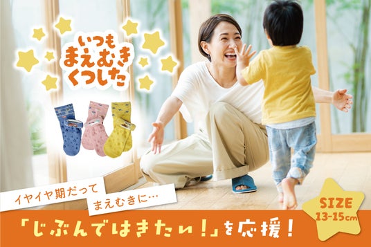 「いつもまえむきくつした」は、子育て中のママ社員が経験したイヤイヤ期の悩みから生まれ、一般から募集したママたちとの座談会や着用アンケートを経て完成しました。しかけ絵本のような面白さのある履き口や、失敗0を目指せる「かかとなし設計」により、お子様一人でも履きやすく「自分でできた!」という達成感を育みます。