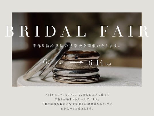 6月1日~14日をフェア期間とする〈ブライダルフェア〉を新設いたします。見学・ミニ制作体験、見積もりシミュレーションをワンストップで体験できるほか、来店者限定の豪華特典をご用意しました。
