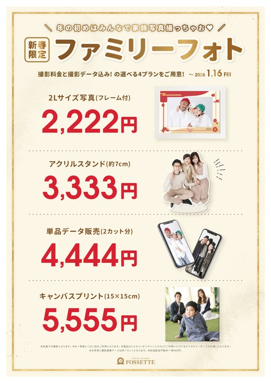 株式会社SAホールディングス(本社:広島県呉市、代表取締役:相川真太郎)のグループ会社である株式会社スタジオアイ(本社:同、代表取締役:同)が運営する「トータルスタジオフォセット」では、毎年恒例となる新春キャンペーン「ファミリーフォト2026」を、2026年1月2日~16日(※一部店舗は1日~)の期間で開催し、撮影料金とデータを含めた2,222円~の4種類のお年玉プランを用意します。