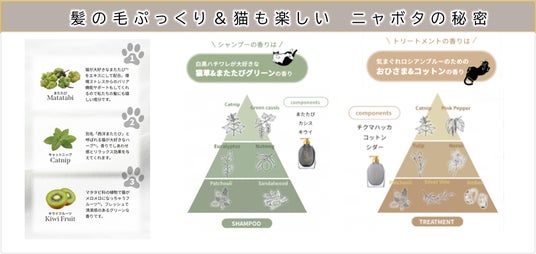 猫がしあわせ感を感じる香りを独自抽出して、季節の代わり目のどんよりとした気持ちを晴らすように爽やかであたたかい香りを3D構造フレグランスとして設計。 シャンプーとトリートメント、2つの香りに猫モテの香りを立体的に配置することで、6割の猫さんが「たまらニャイ」と答えた*香りが完成しました。