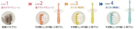 乳歯ブラシは、月齢・歯の生える時期を4ステップに分類。それぞれの時期の発達に合わせて歯ブラシを選ぶことができます。仕上げブラシは、握りやすい三角形状の柄で赤ちゃんのみがき残しの汚れを落としやすい歯ブラシです。また仕上げみがきの際に口を閉じてしまう、歯ブラシを噛んでしまうというお悩みに応えて生まれた「カミカミガード」をセットにしたタイプもあり、お子様の開口を促しスムーズな仕上げみがきをサポートします。歯ブラシはやわらかく毛先が広がりにくい※PBT(ポリブチレンテレフタレート)毛を採用。歯のすき間までしっかり届く2段のブラシ構造です。