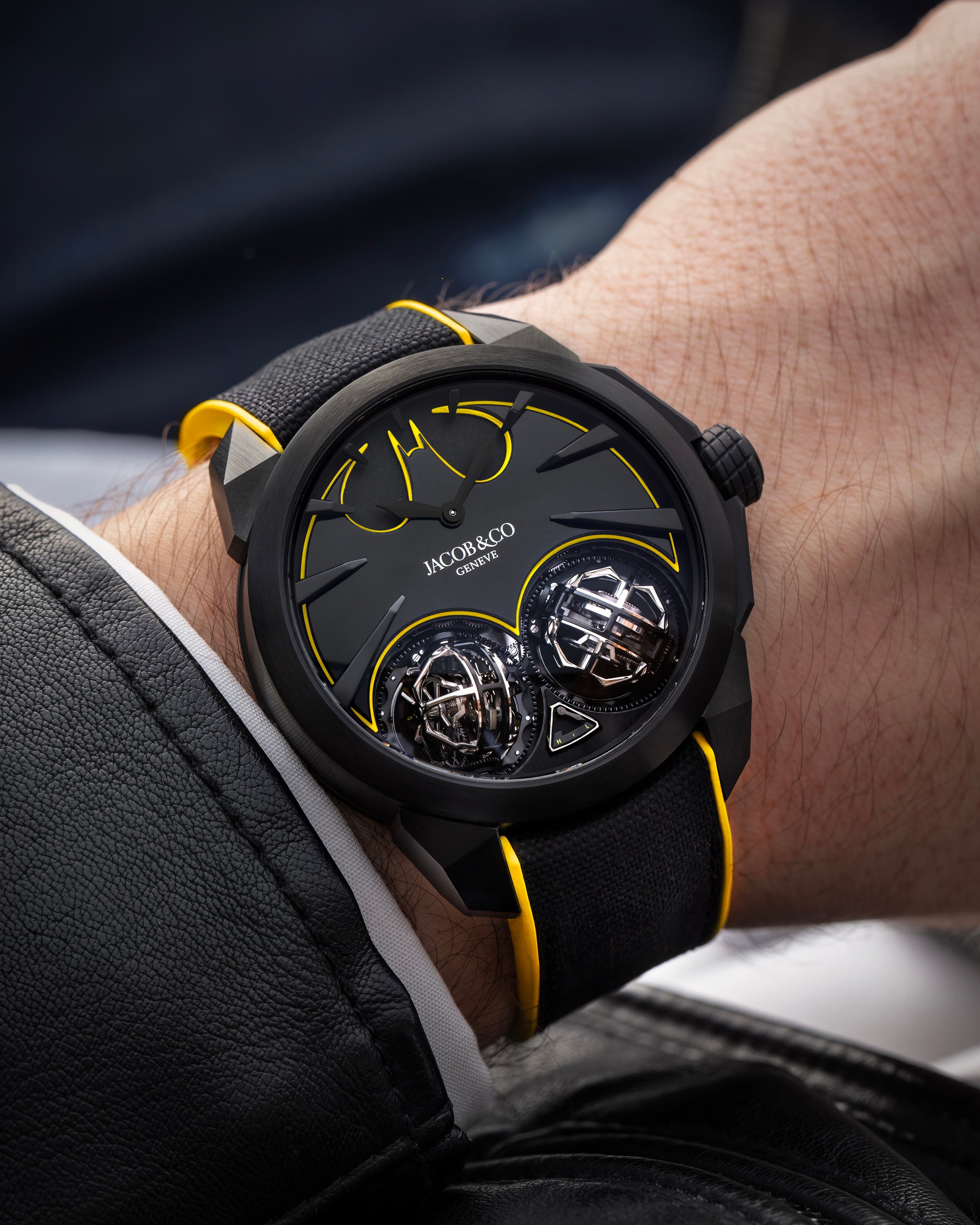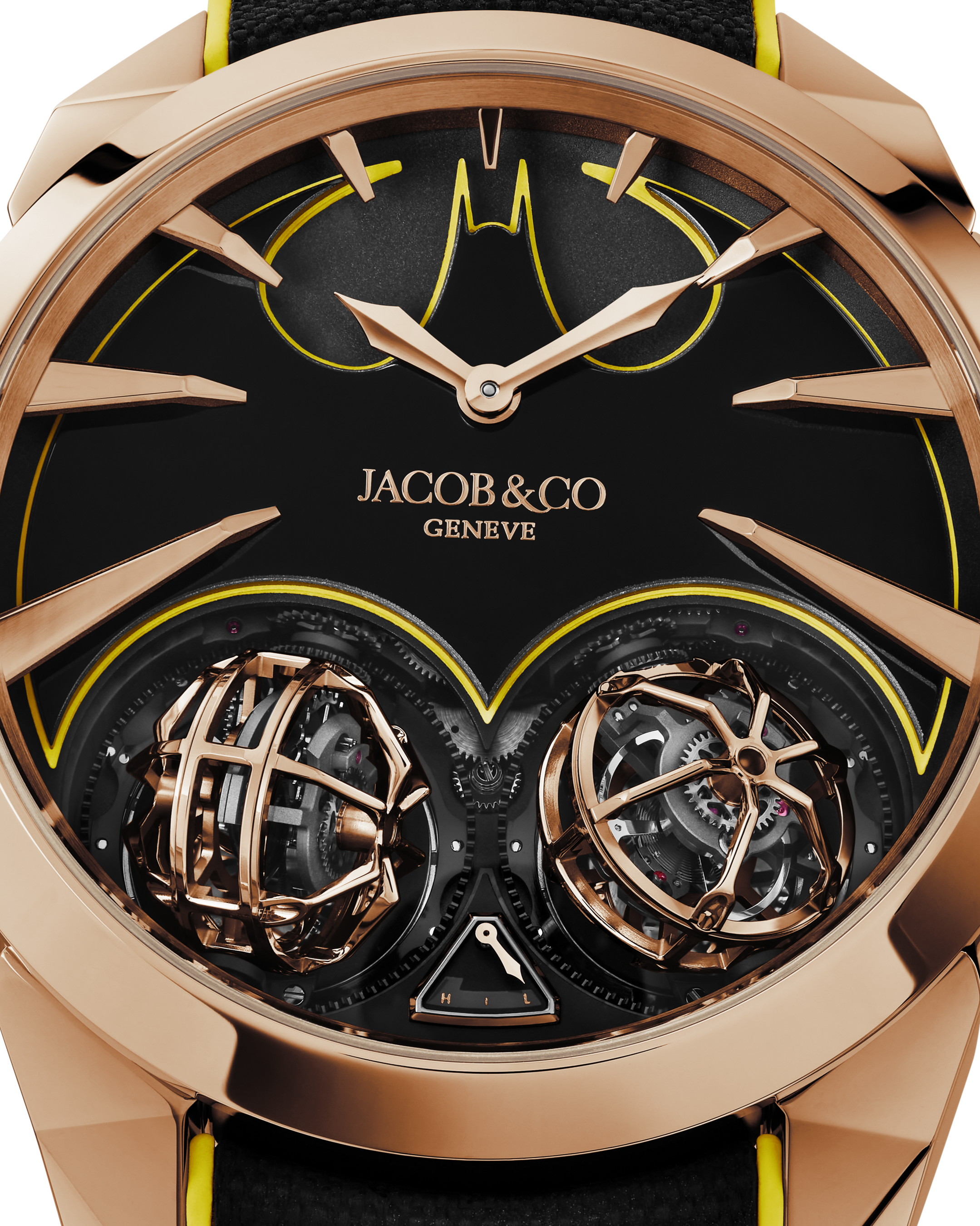 バットシグナル型のオニキス製ダイヤル、バットラングを想起させるハンド、グラップリングフックを思わせるトゥールビヨンのキャリッジ