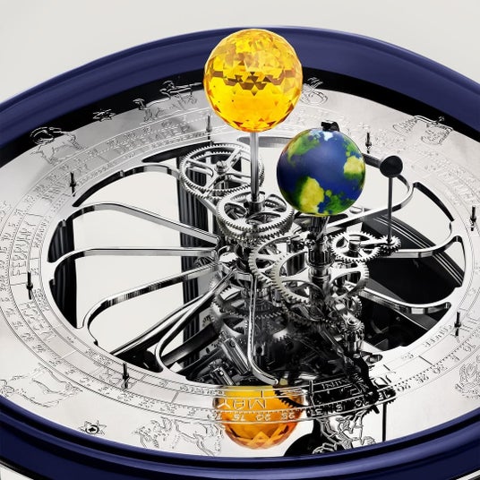 高さ35cm、幅29cmのケースに、8日間パワーリザーブの打鐘ムーブメントを搭載。黄道十二星座に対する天体の位置表示や恒星年に基づくカレンダー、288面カットのジェイコブカット・シトリンによるサンモチーフなど、Astronomiaの思想をクロックとして凝縮した内容です。