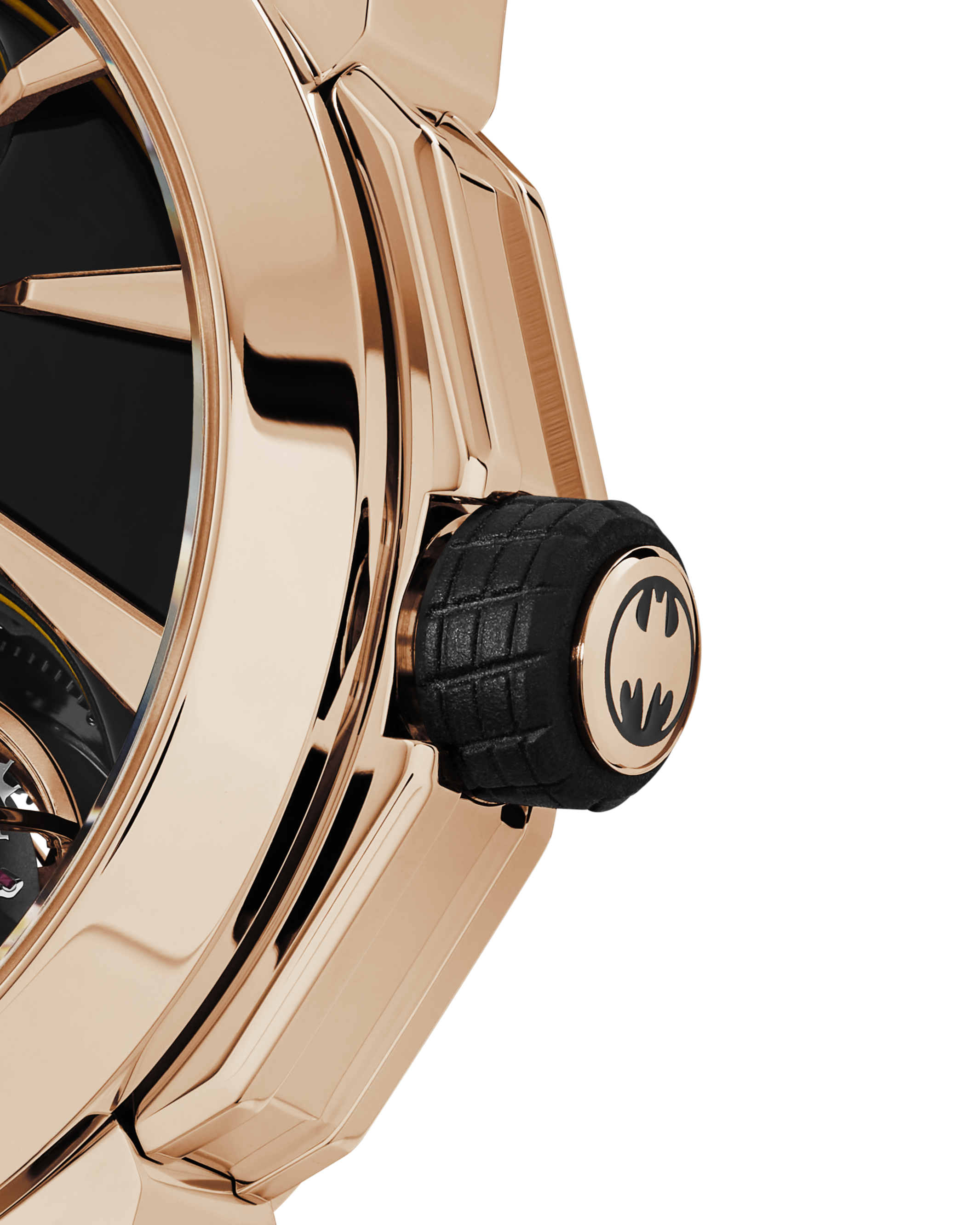 リューズには巻き上げ効率を上げる機能部品としてラバーが取り付けられ、その形状はバットモービルのタイヤをモチーフとしている