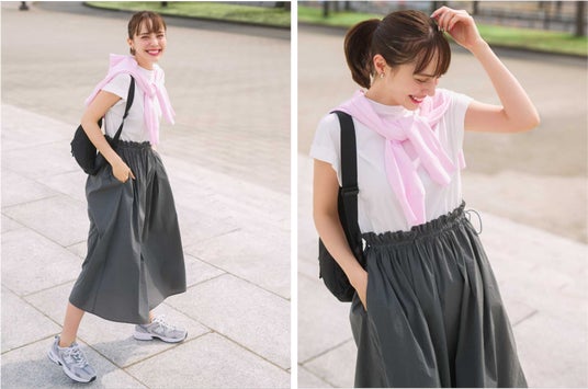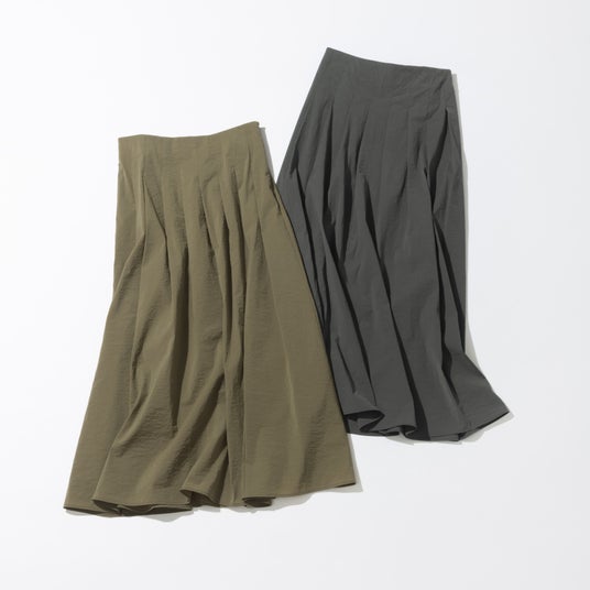 「タックフレアスカート」は、ドレープ感が華やかなフレアシルエットのスカート。ウエスト周りのタックは中縫いにすることでボリュームをおさえ、腰回りをすっきり見せる工夫を施しています。軽い素材と高いストレッチ性に加えて、ウエストの後ろをゴム仕様にすることで窮屈感のないはき心地です。
