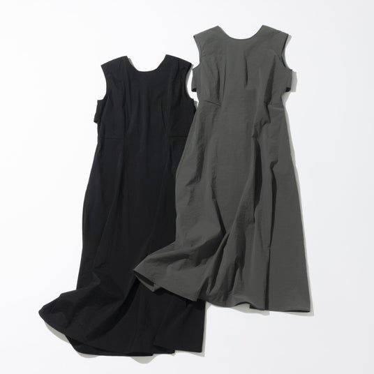「ハイストレッチナイロンフレアワンピース」は、コンパクトな上半身と、ふわっと広がるフレアシルエットのスカートが、メリハリのあるボディラインを叶えます。背中のヨーク切り替えで通気性を高め、肌に触れる内側の生地には清涼素材を使うなど、熱がこもりにくい工夫を施しています。脇のラインに沿ってポケットを付けることで、シンプルなデザインを邪魔することなく、実用性のある一着に仕上げています。