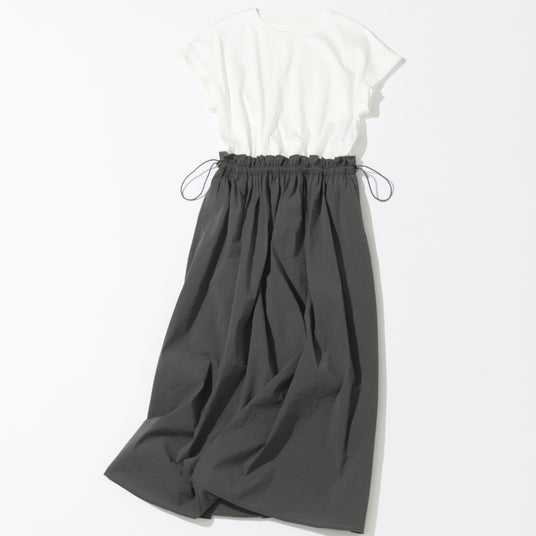 今年新登場する「ドッキングワンピース」は、上身頃に綿素材を使用し、1枚でセットアップ風のスタイルを楽しめます。ハイウエストで切り替えたフレアースカートが足を長く見せ、首に沿う細めのクルーネックラインがデコルテを美しく演出します。また肩に自然と馴染む緩やかなドロップショルダーとダブルカフスが腕まわりをすっきりと見せます。腕を上げてもインナーや素肌が見えにくい設計になっているのも嬉しいポイントです。