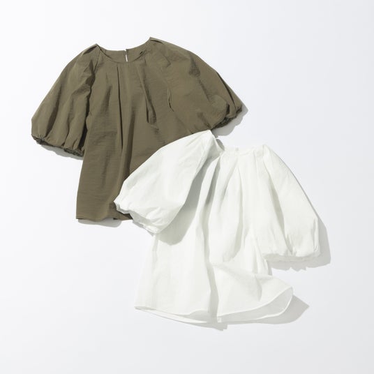 袖口のギャザーでボリュームを出したバルーンスリーブが特徴の「ハイストレッチナイロンパフスリーブブラウス」。ネックラインに入っているタックは顔まわりを華やかにするだけでなく、上半身に視線を集め、スタイルアップを叶えます。