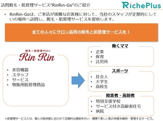訪問脱毛・肌管理サービス“リンリン・ゴー”は、働くママ、スポーツ選手、障害者、高齢者など店舗への来店が困難な美容に興味がある人々のために立ち上げたサービスです。当社のスタッフが企業、保育園、託児所、大学、高校、高齢者住宅、病院などを定期的に訪問させていただき、施術サービスや物販などを提供いたします。
