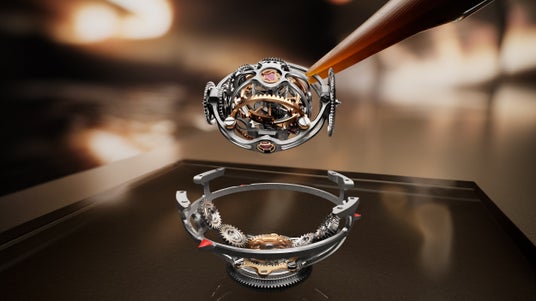 プラチナ製ケースには、新たな3 軸トゥールビヨンを搭載するキャリバーが収められ、メティエ・