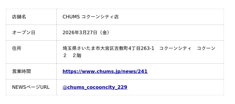 株式会社ランドウェル(東京都港区北青山、代表取締役:土屋芳隆)は、2026年3月27日(金)に、日本総代理店を務めるアウトドア・カジュアルブランド「CHUMS(チャムス)」の直営店を埼玉県さいたま市の商業施設「コクーンシティ」内にオープンします。