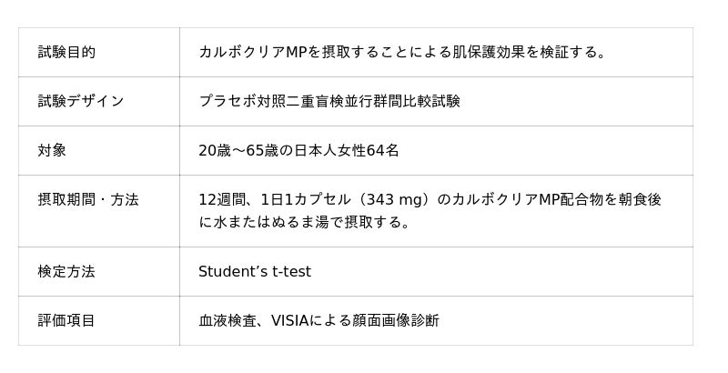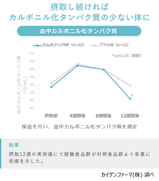 まず、カルボクリアMPを12週間継続摂取することによって血中カルボニル化タンパク質の減少が認められました。