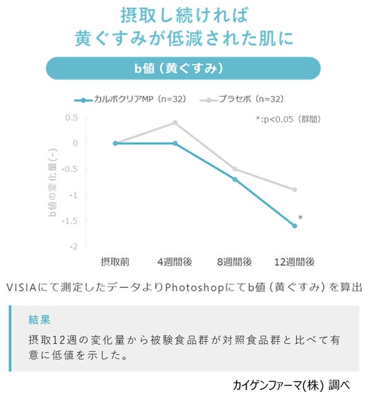 次に、カルボクリアMPを12週間継続摂取することによってb値(黄ぐすみ)の低減が認められました。