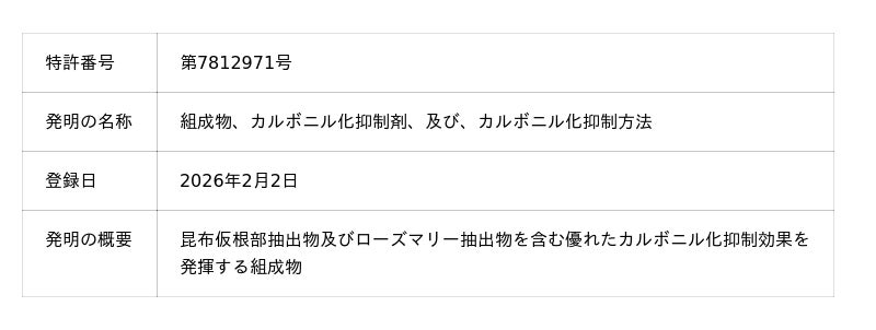 カルボクリアについて、以下の特許を取得しました。今後この特許技術を、抗カルボニル化作用を持つ製品の開発に応用して参ります。