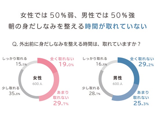 20~40代男性および女性を対象にしたヘアケアに関する調査*¹によると、女性男性どちらも、外出前の身だしなみに、時間が取れていない人は約半数、2人に1人はとれてないことが明らかになりました。特に男性では若い世代になればなるほど、朝の身だしなみを整える時間が全く取れていない傾向にありました。そこでヘアスタイルづくりの手間を、手抜きにならずに、ストレスフリーで気軽に楽しむ商品として、「ミューツトッテ ボンディングゲル」を発売するに至りました。